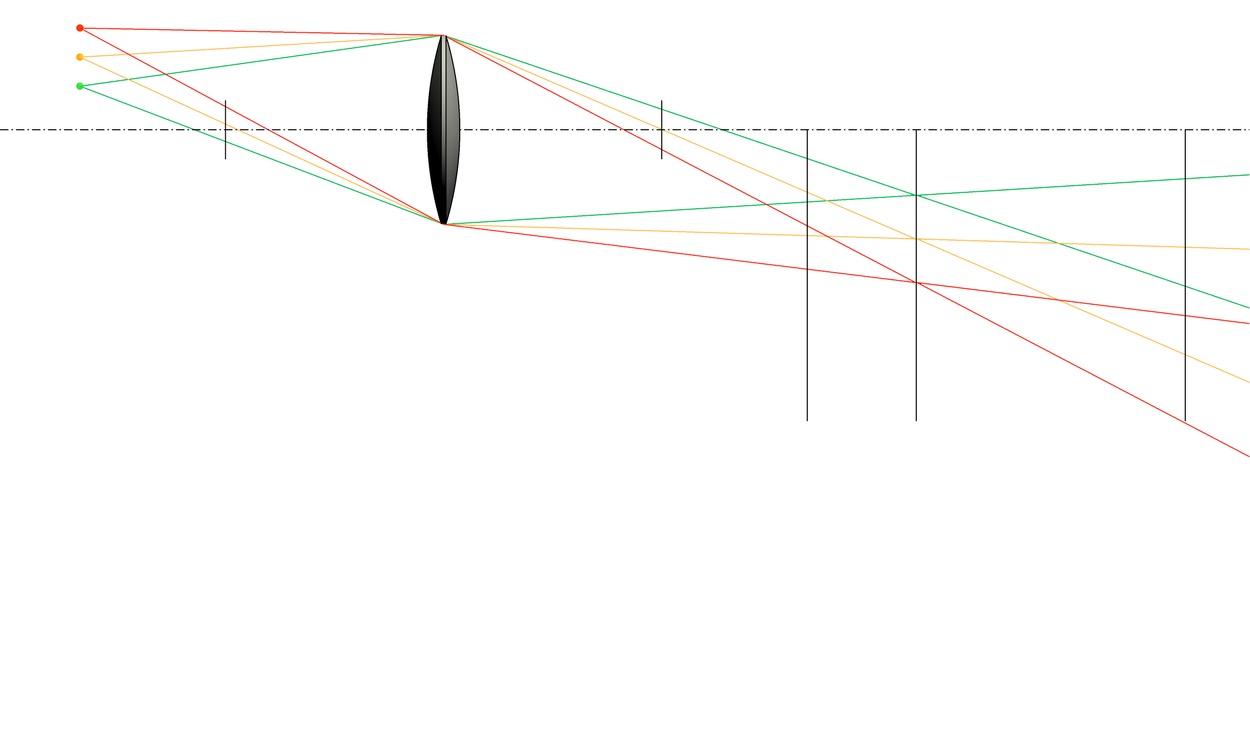 Eine Linse mit den Randstrahlen zu drei Objektpunkten zur Veranschaulichung des Begriffes eines Bildes
