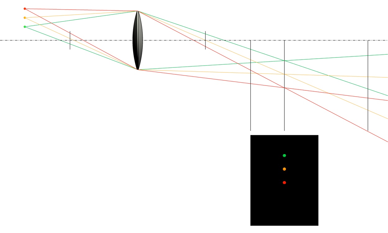Nur beim korrekten Abstand werden die drei Punkte scharf abgebildet und es entsteht ein Bild im physikalischen Sinn.