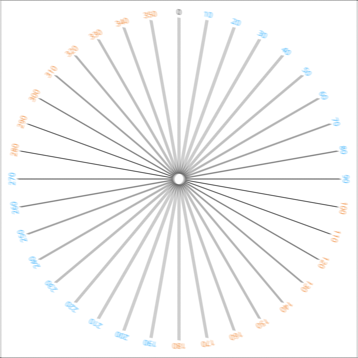 Eine Steigerung des Effektes; man beachte vor allem die Linien, die (bewusst mit verschwommen dargestellten) Ziffern sind kein verlässlicher Anhaltspunkt. So würde sich Bild 00 etwa einer Person mit entsprechendem Astigmatismus darstellen (verifiziert an Hand des Auges der Erstellerin (anderer Winkel, aber der entstehende Seheindruck passt recht gut)).