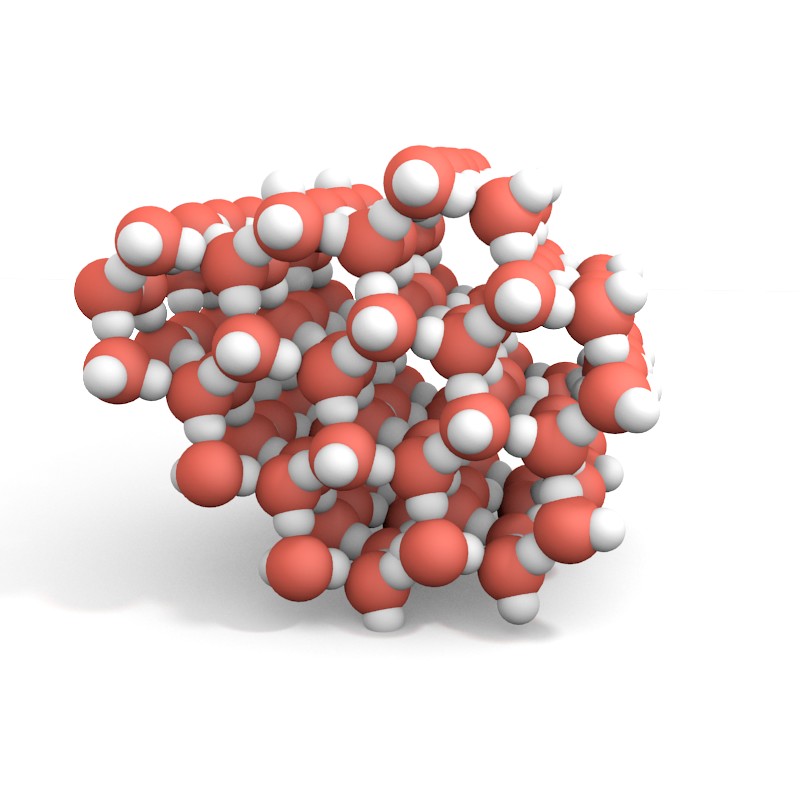 Im festen Zustand ordnen sich die Wassermoleküle zu sechseckigen Strukturen an; in diesem Bild ist zu erkennen, wie sich dadurch „Hohlräume“ bilden, die im flüssigen Zustand nicht vorhanden waren. In diesem Bild sind gleich viele Moleküle verbaut, wie im ersten Bild der Serie.